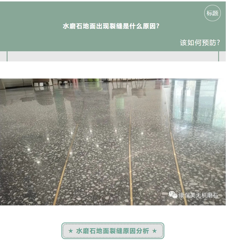 2、樓地面上的水磨石層產(chǎn)生裂縫,主要是施工工期較緊,結(jié)構(gòu)沉降不穩(wěn)定;墊層與面層工序跟得過緊,墊層材料收縮不穩(wěn)定,暗敷電纜管線過高,周圍砂漿固定不好,造成面層裂縫。