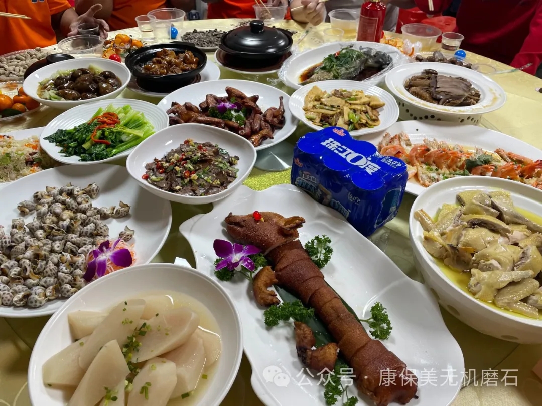 年會上準(zhǔn)備了豐盛的菜肴,有大蝦、魚、雞、牛肉、豬肉、青菜,酒水等等。
